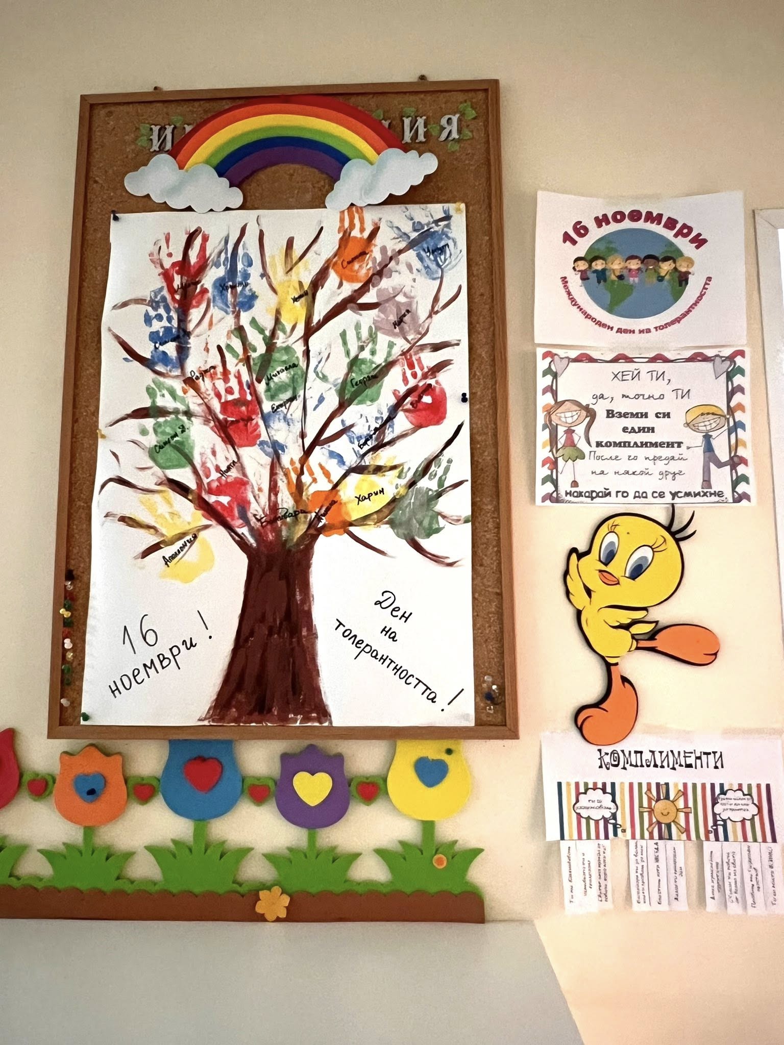Под този надслов преминаха заниманията на децата по случай16.11.- “Международният ден на толерантността” като малчуганите се запознаха по достъпен начин с думичката „толерантност“ и добродетели, необходими за изграждане на нравствени ценности у децата. В знак на това, че приемат различията в хората, децата от четвърта група “Шарена дъга” си направиха “Дърво на приятелството” и си обещаха да са уважителни, да се изслушваме и винаги да се стремят към добри дела! В инициативата се включиха и родители като получиха специални комплименти с мисия да предадат към следващ човек, защото в забързаното ни ежедневие доста често забравяме да си кажем по нещо хубаво, което може да ни усмихне!