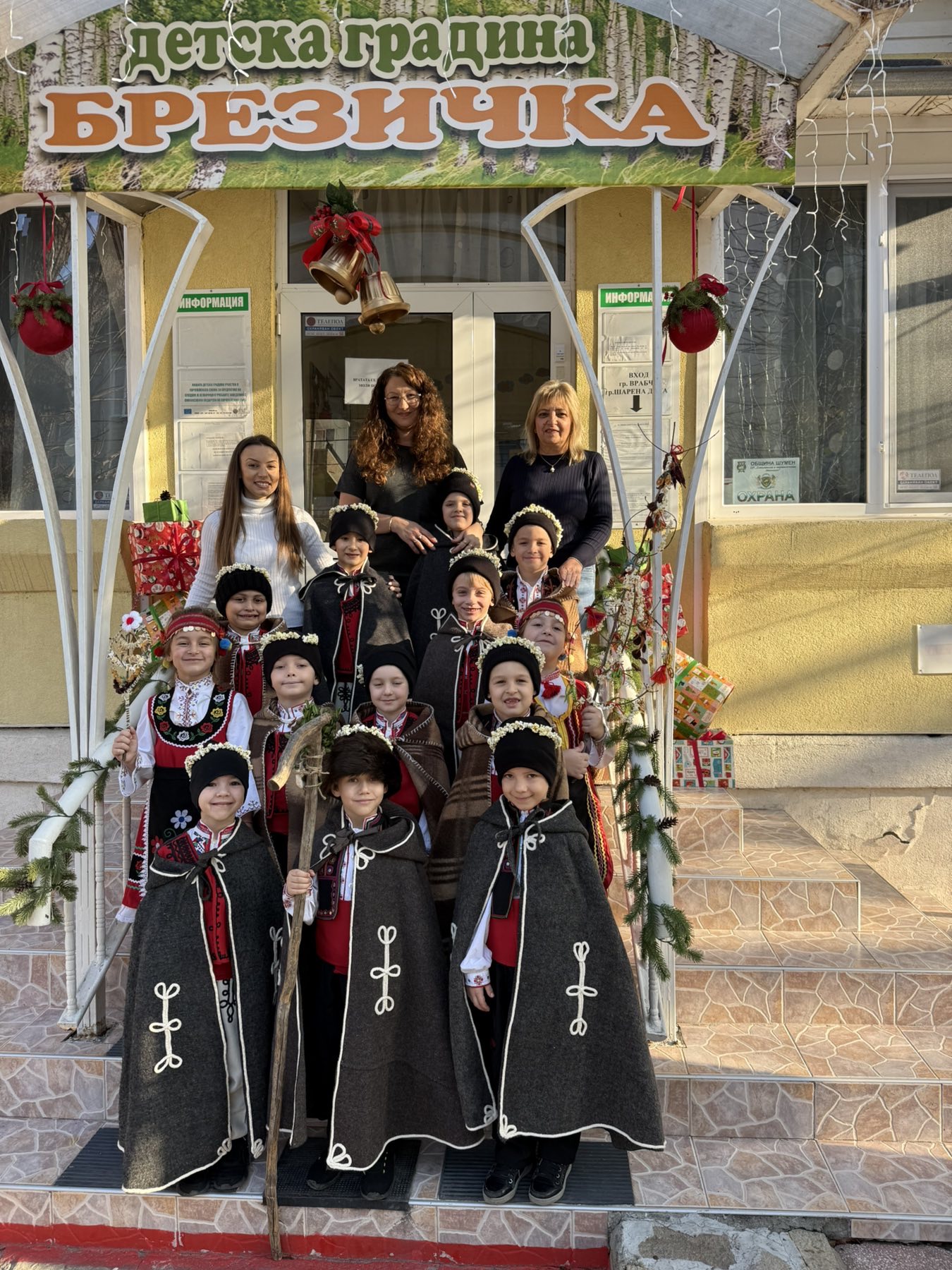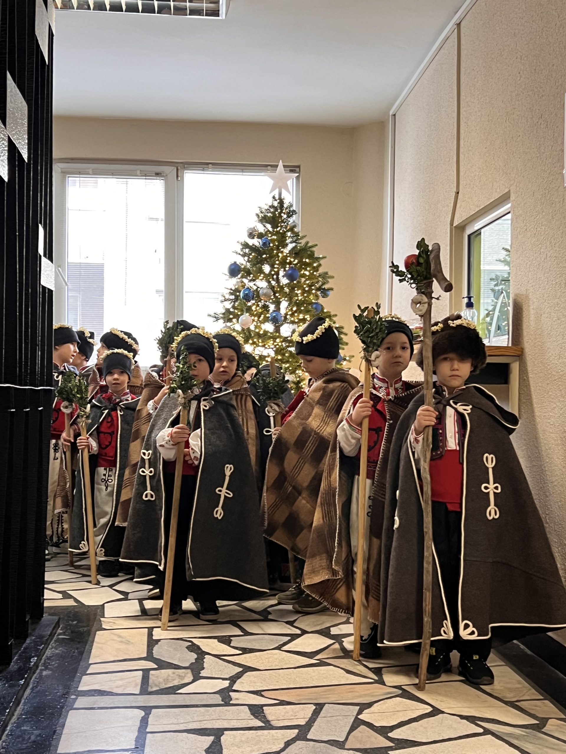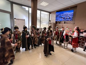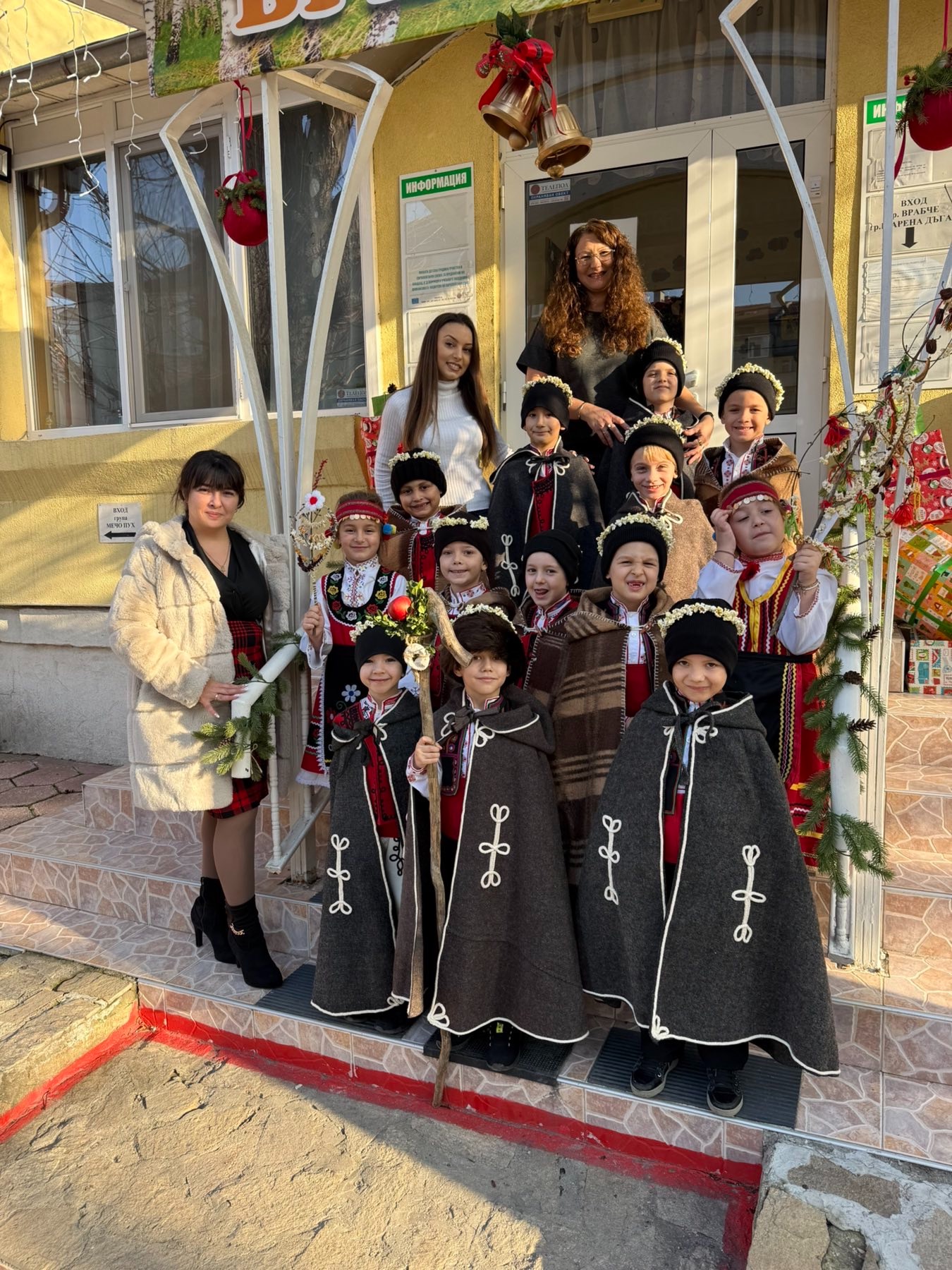 Както повелява традицията, скъпите вестители на доброто бяха облечени с народни носии, калпаците им бяха украсени с нанизани пуканки, а гегите им – накичени с кравайчета и чемшир, за да има изобилие от блага за домакините през идната година! С вълшебните си слова и песни коледарите донесоха много усмивки и празнично настроение на всички!