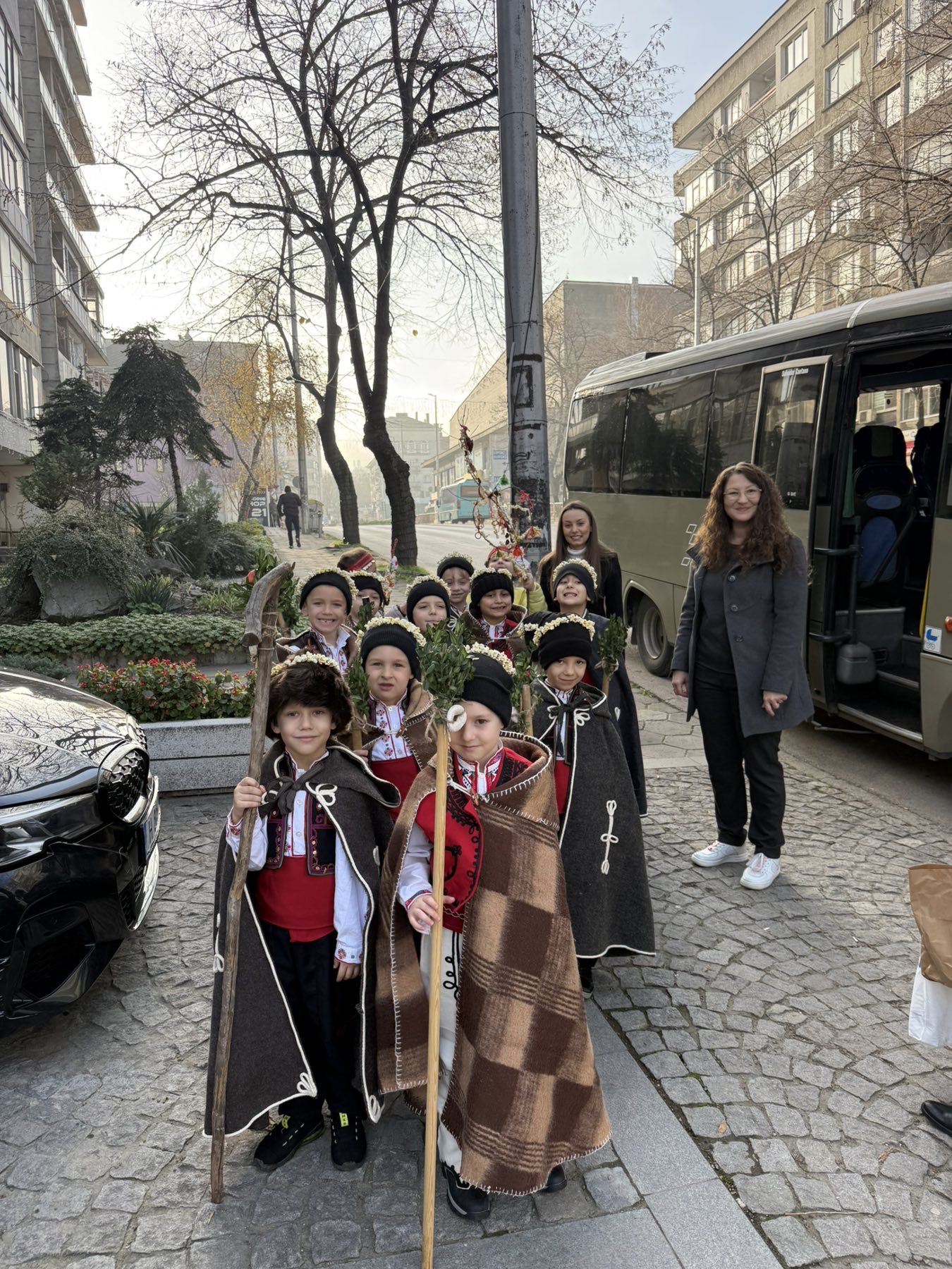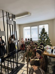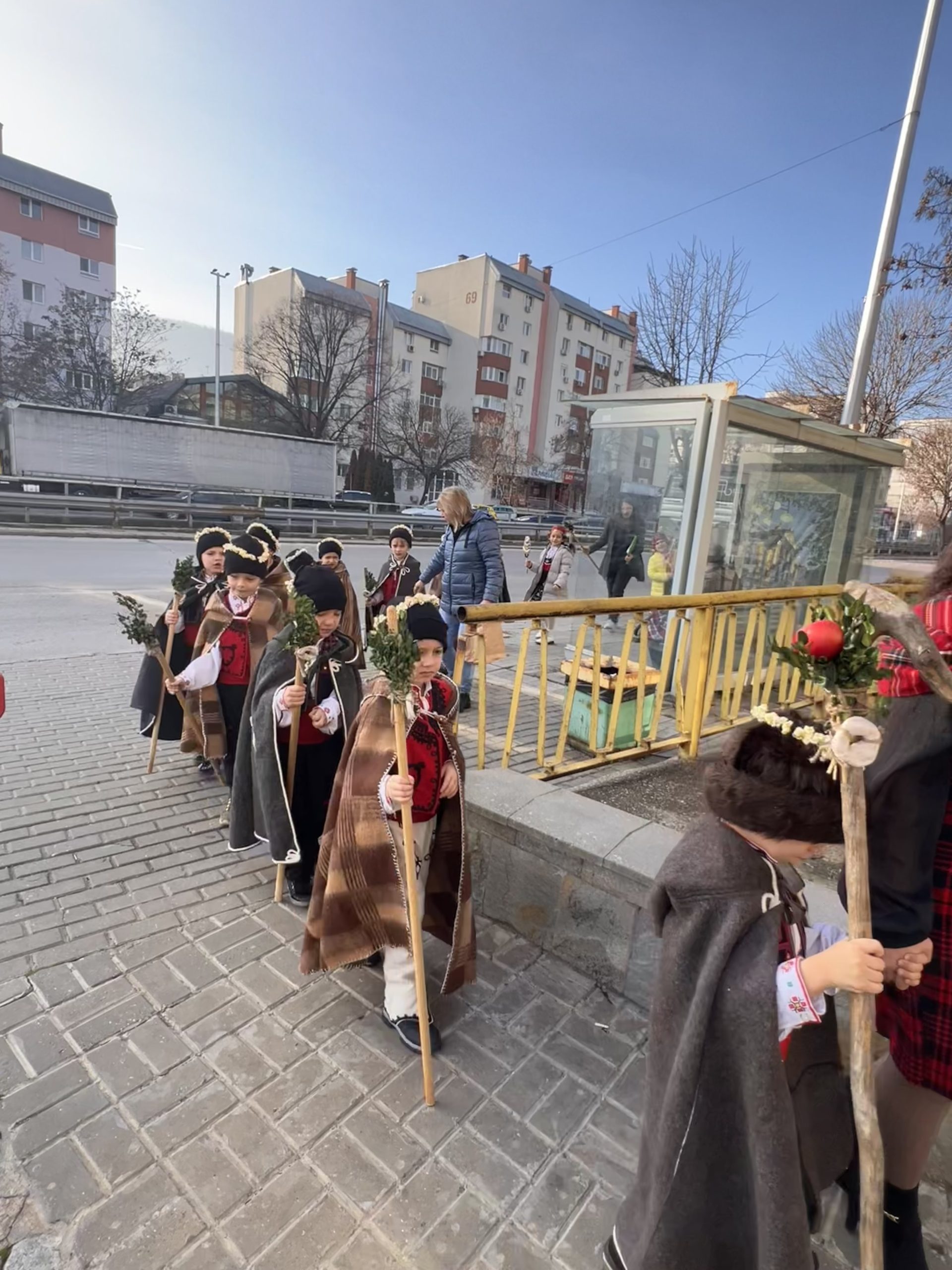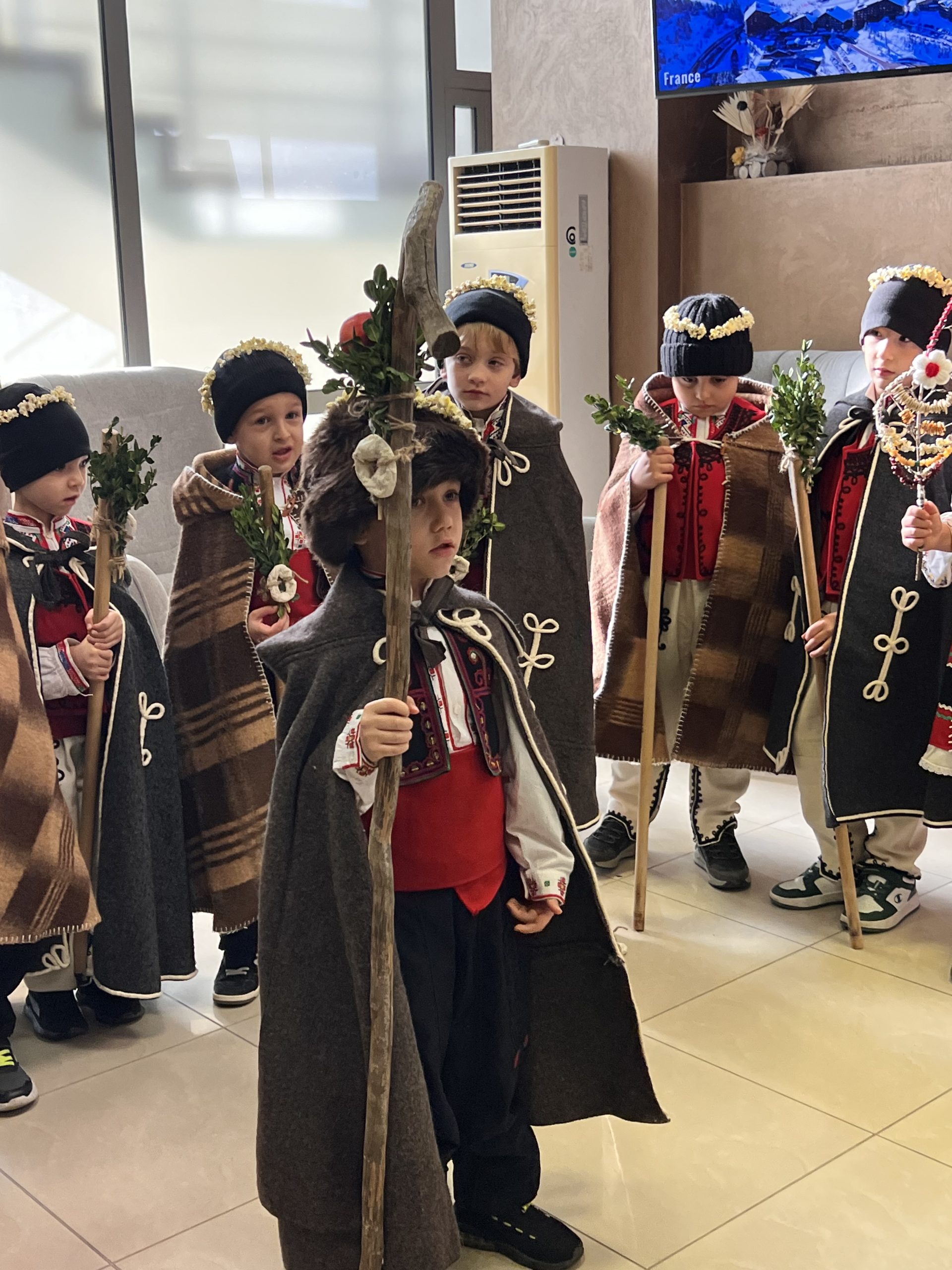 Както повелява традицията, скъпите вестители на доброто бяха облечени с народни носии, калпаците им бяха украсени с нанизани пуканки, а гегите им – накичени с кравайчета и чемшир, за да има изобилие от блага за домакините през идната година! С вълшебните си слова и песни коледарите донесоха много усмивки и празнично настроение на всички!