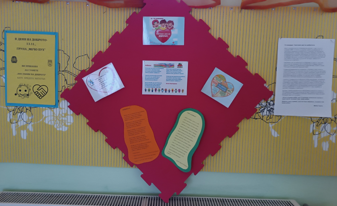 В трета група „Мечо Пух децата споделиха своя добра постъпка, която бе записана и залепена на ръчичка. Украсиха сърце с послание за Деня на доброто.